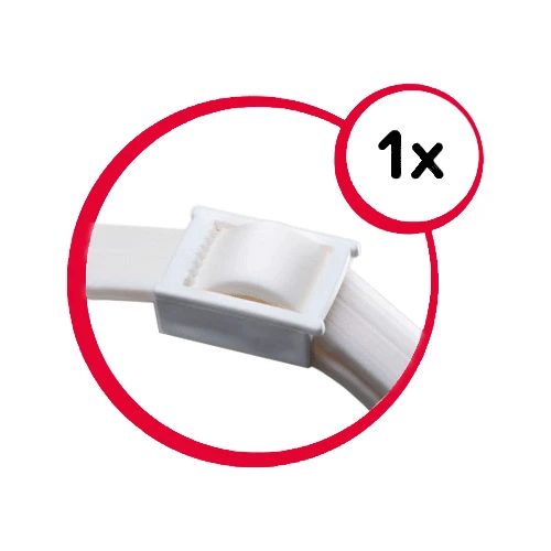 Öffnen Sie die Verpackung kurz vor der Anwendung. Rollen Sie das Halsband aus und aktivieren Sie es durch kurzes Ziehen an beiden Enden. Dann können Sie das Halsband um den Hals Ihres Hundes legen. Legen Sie das Halsband locker an und achten Sie darauf, dass zwei Finger zwischen Hals und Halsband passen. Schneiden Sie den Teil ab, der vom Halsband übrig bleibt. Waschen Sie sich nach dem Anlegen des Halsbandes sofort gründlich die Hände mit Wasser und Seife.